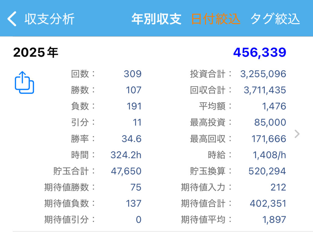 今日マイナスでも、正しい行動(期待値を積んで、ダラダラ打たない)をしていれば、必ずプラスに収束します。